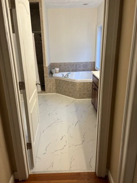 New vanity cabinetry was selected to seamlessly match the recent kitchen remodel, creating a sense of continuity and polish. Updated hardware throughout the space adds a subtle but meaningful layer of refinement, instantly elevating the overall look and feel.