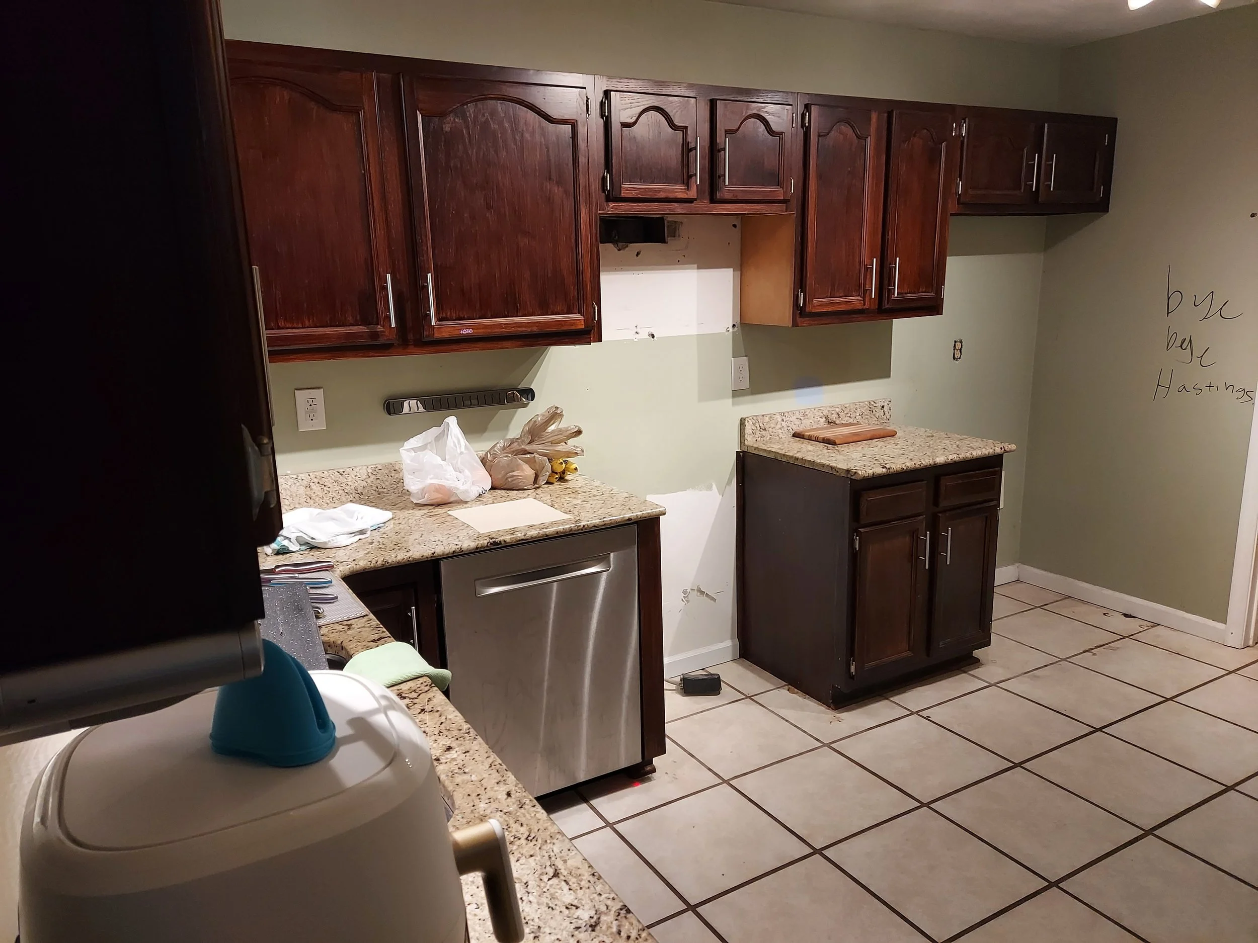 The walls, pantry, and half wall created separation that limited flow, light, and usability, and the original layout couldn’t accommodate the homeowner’s needs for a large island, integrated dining, and a dedicated desk area.