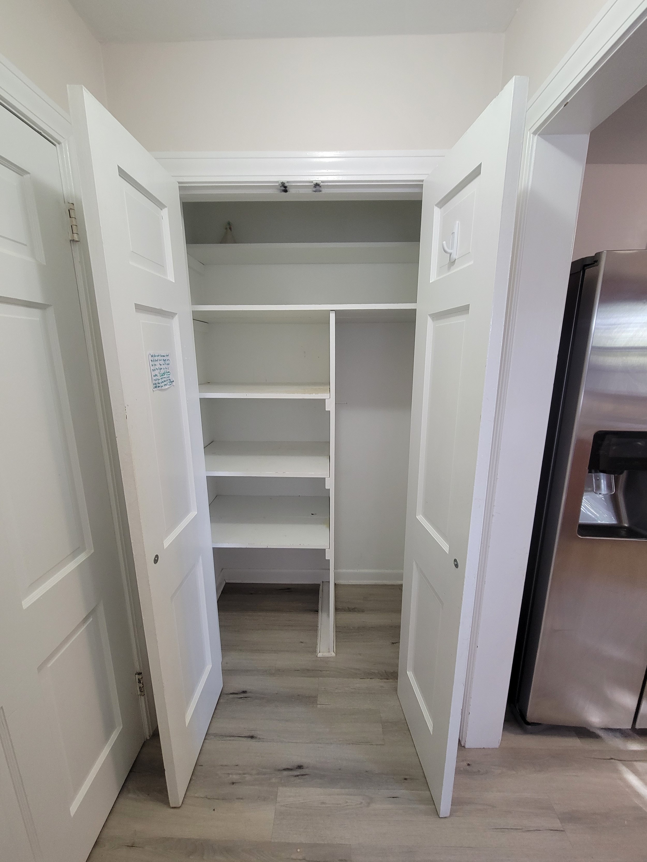 By opening the kitchen and dining room into one shared space and introducing a wide, thoughtfully placed opening between the dining and living areas, the home now feels expansive and light-filled while still maintaining a sense of structure. The kitchen gained valuable wall space for a cleaner, more functional layout, and storage was dramatically improved with a beautifully integrated pantry solution designed to feel both seamless and substantial.