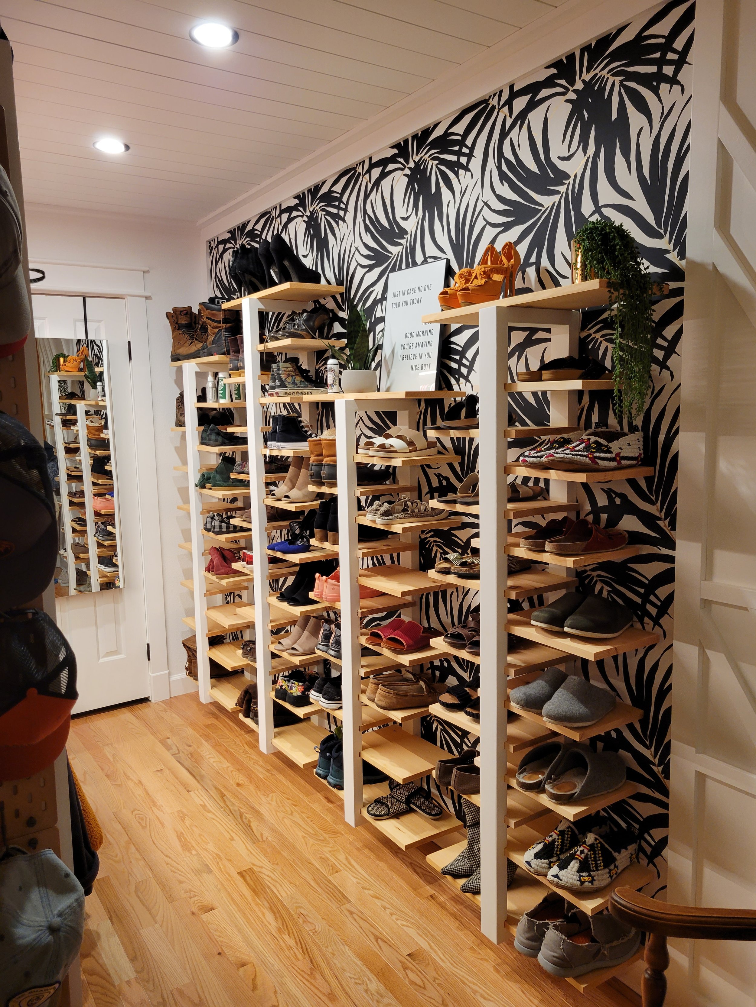 Inspired by a neighbor’s clever layout, a partial wall was introduced to define the new closet space while allowing light to flow freely from the window into both the bedroom and closet. Within this newly carved area, a custom “hers” closet was created with thoughtfully designed shelving, integrated lighting, and built-in shoe storage, handcrafted by Tony to accommodate an extensive collection.