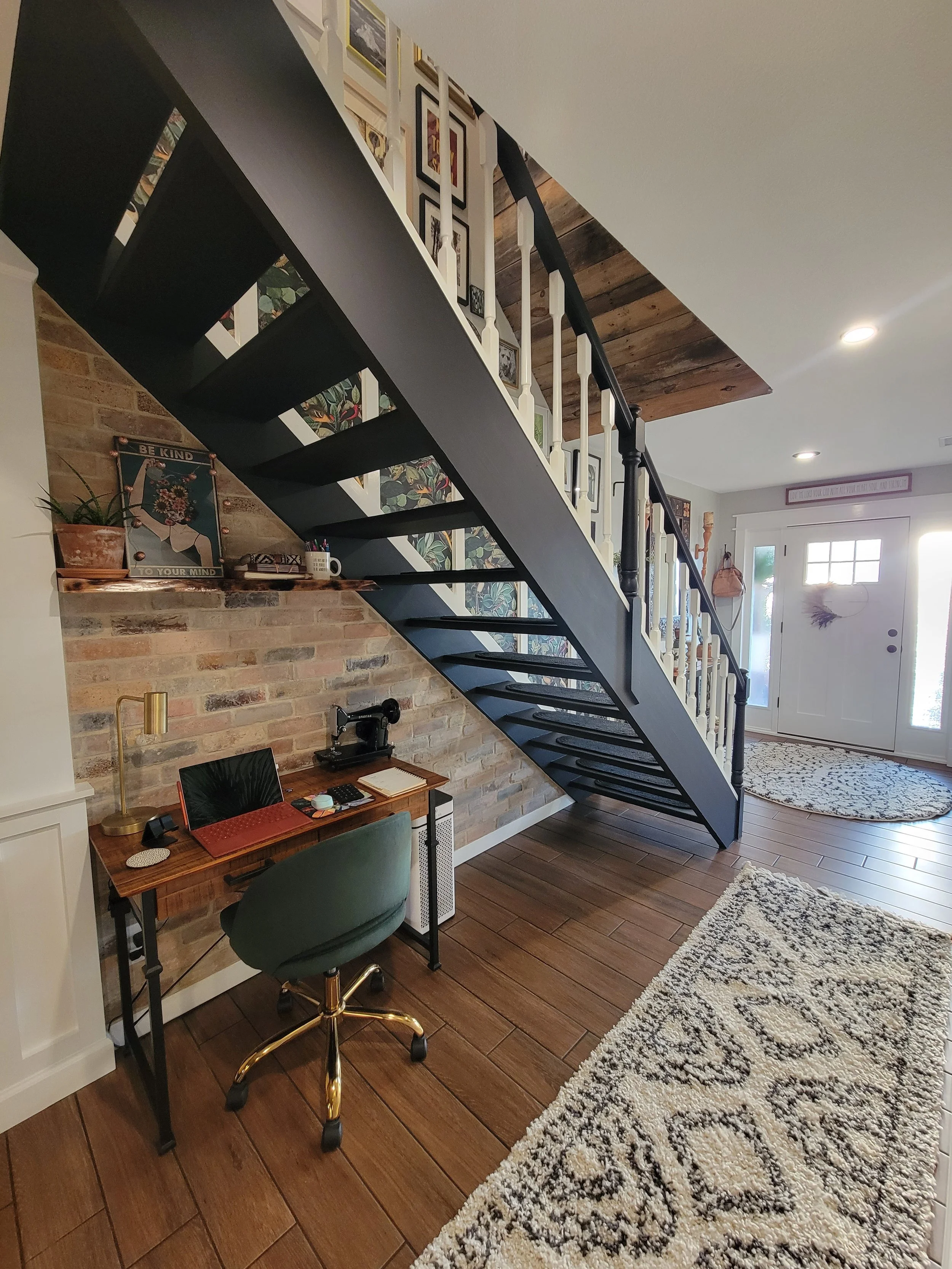 During the downstairs remodel, unused space beneath the stairs was transformed into a compact work area, proving that even the smallest spaces can deliver big design moments.