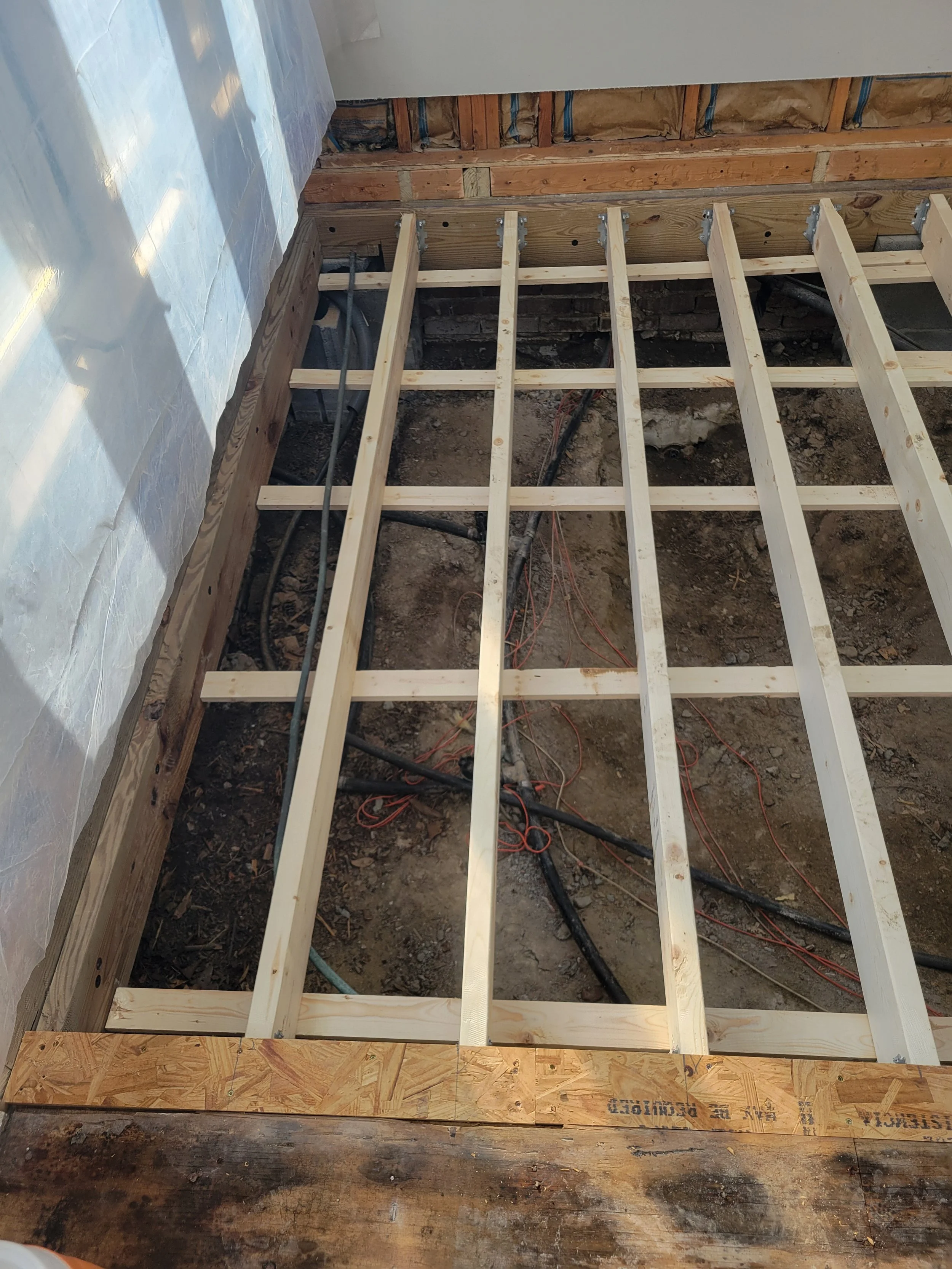 Removing the tub required rebuilding the floor structure and correcting uneven framing so the room could support a finished, tiled floor.
