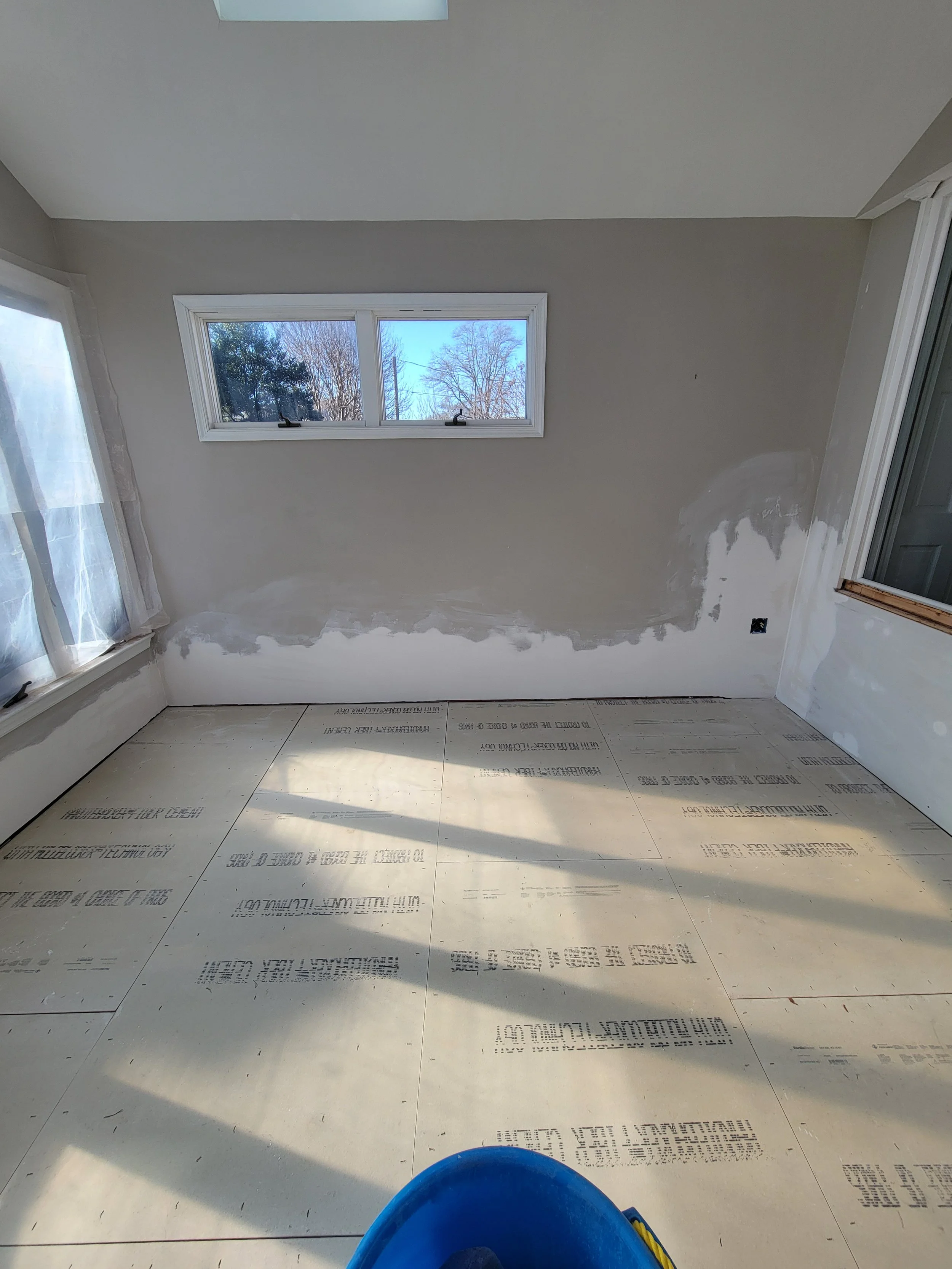 With the structure corrected, a new subfloor was installed and prepared with an uncoupling membrane, allowing the space to be properly tiled. Additional drywall repairs were completed, along with finish carpentry, to ensure the room felt cohesive and well-finished from wall to wall.